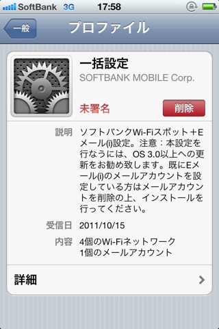 「設定」 → 「一般」 → 「プロファイル」 → 「一括設定」 → 「プロファイルを削除」 → 「削除」を選択