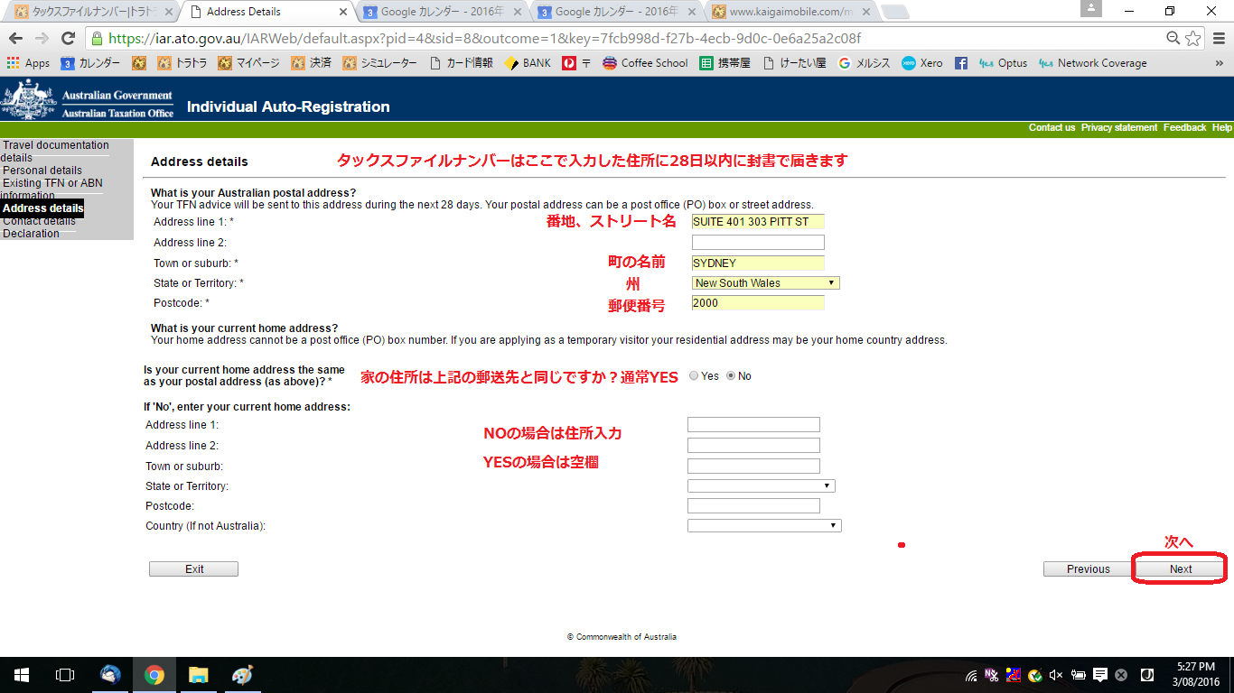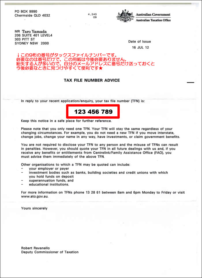 タックスファイルナンバー(9桁の番号)は郵送で届きます。取得には1ヶ月かかることもあります。郵送で送られてくるので、オーストラリア国内の郵送先住所が必要です。申請後1ヶ月くらいは滞在する、もしくは郵便を受けることができる住所が必要です。