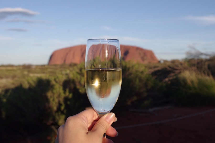 ウルルで夕日を鑑賞するために移動。旅の仲間と乾杯!ウルルサンセットをお楽しみください。