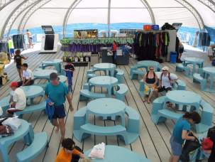 出発の15:30分までシュノーケル、体験ダイビングなど自由行動です。ポンツーンの地下にはガラス張りのリアル水族館もあります。