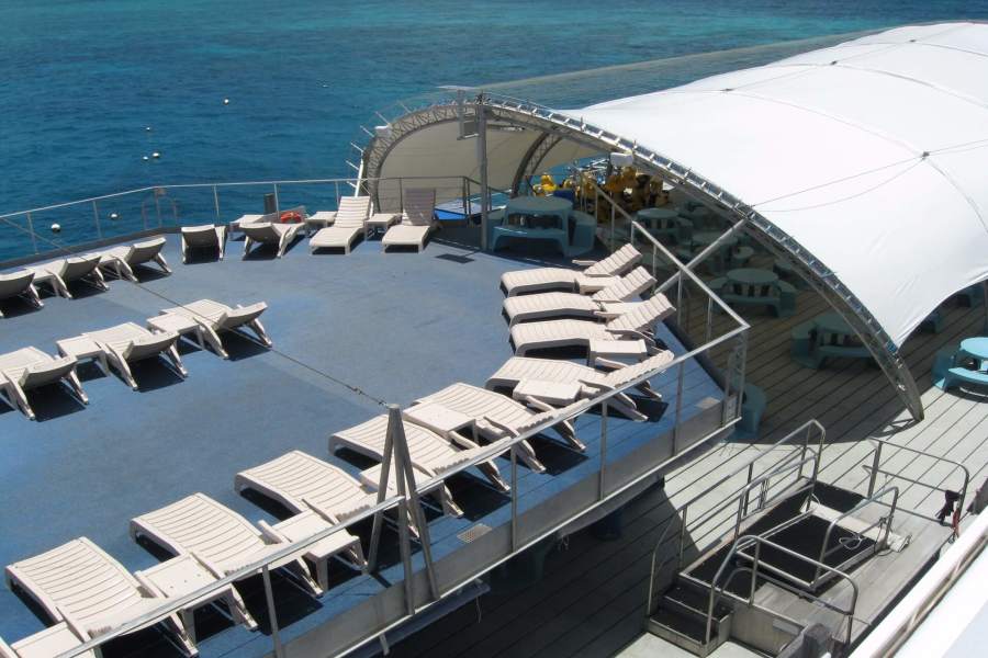 グレートバリア・リーフに浮かぶ巨大な浮島「ポンツーン」に到着。施設内の説明をきいて自由行動になります。