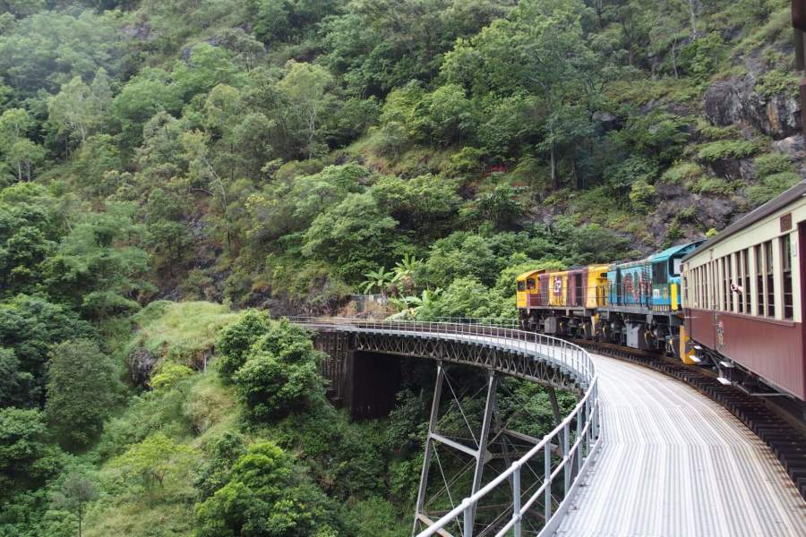 キュランダ駅からケアンズに向けて出発。レトロなキュランダ列車に乗って車窓より壮大な自然と列車の歴史をお楽しみください。