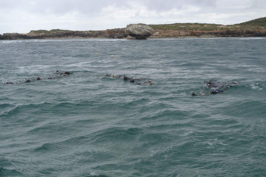 毎年9月から6月までの9ヵ月間パースで催行されるイルカと泳ぐツアーです。パースからバスで50分くらい南に移動した場所にある、ロッキングハムビーチから船で海に出て、イルカと一緒に泳ぐ世界でも珍しいツアーです。海に出るといっても湾内ですので船での移動は30分くらいです。