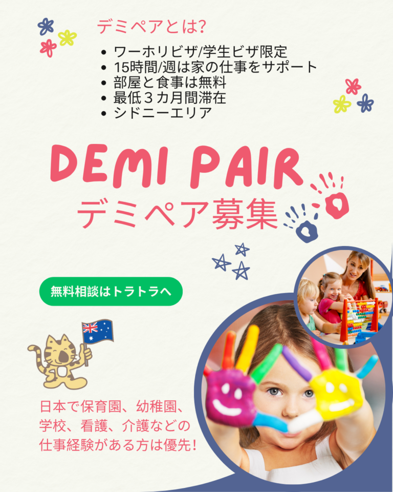 シドニーでデミペアをしませんか? トラトラではシドニーでデミペアとして働きたい方へデミペアファミリーの紹介をしています。家族との会話を通じて、英語の上達も間違いなし!トラトラでは基本的に、子供の世話をしてくれるワーホリ、留 […]