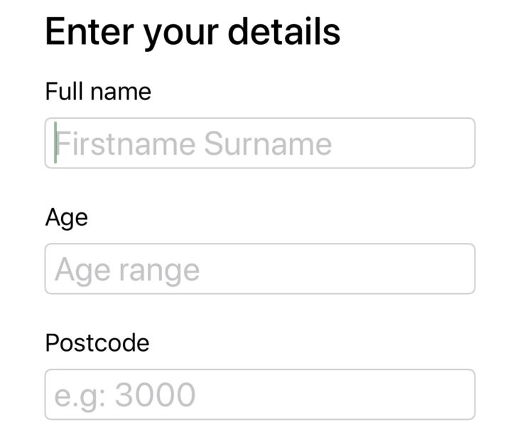 次に自分の詳細(名前・年齢帯・郵便番号)を入力します。