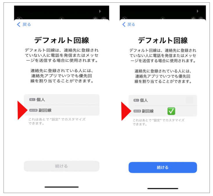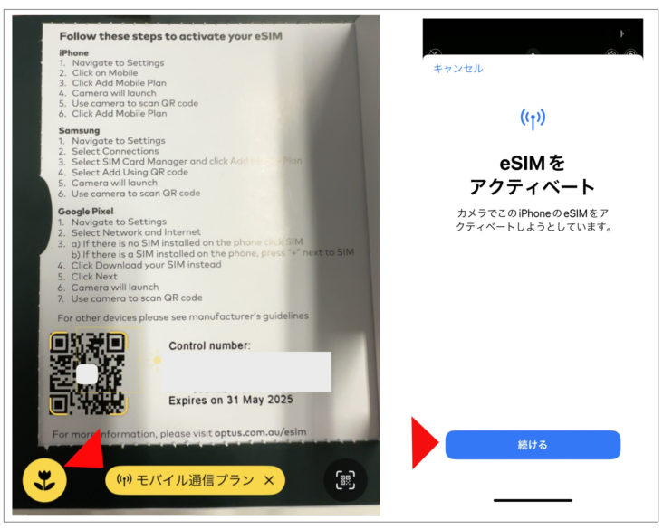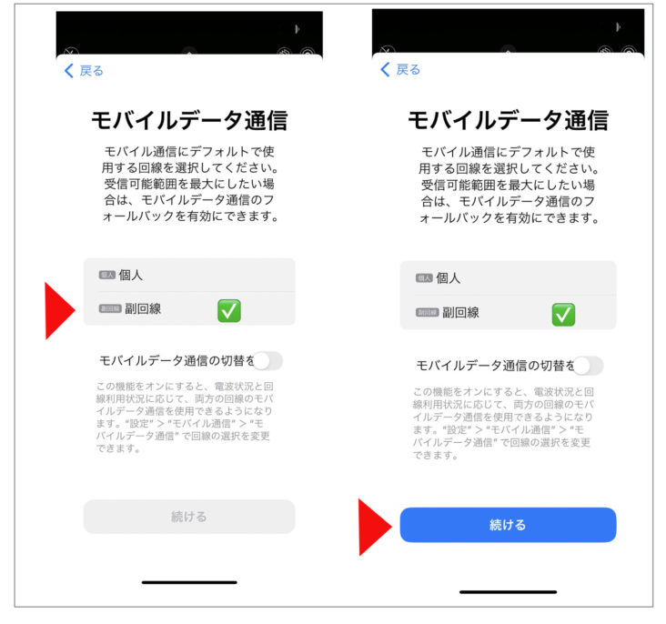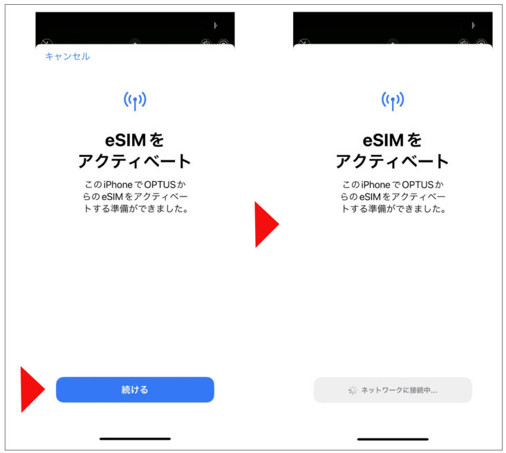 (2) eSIMをアクティベートするため「続ける」をクリック