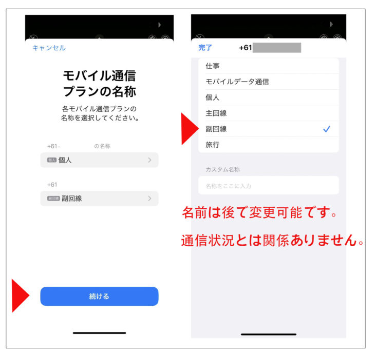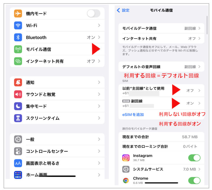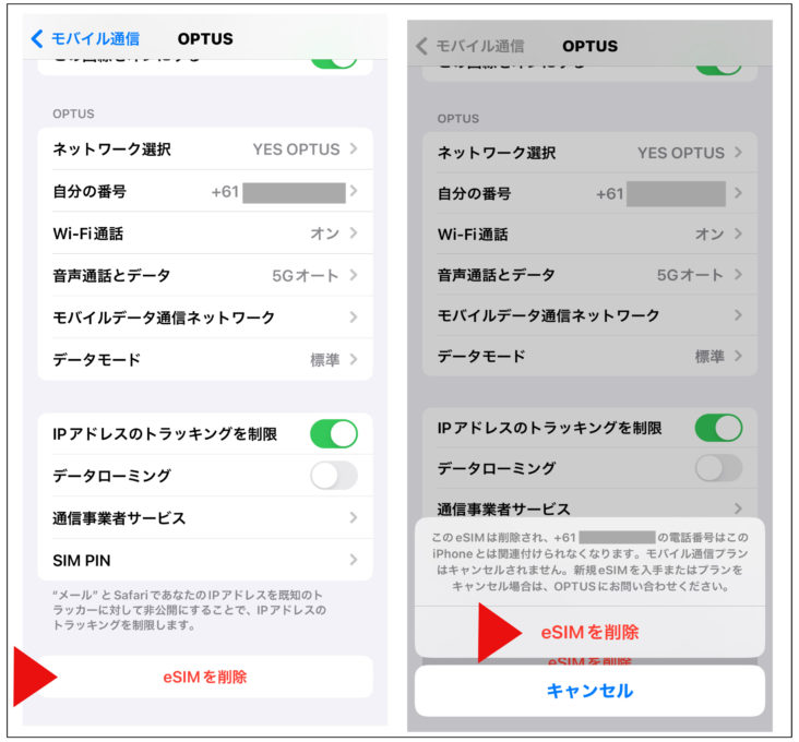 設定-> モバイル通信-> SIM=>ここに新しいオーストラリアの回線が追加されている場合はeSIMを削除しないでください。