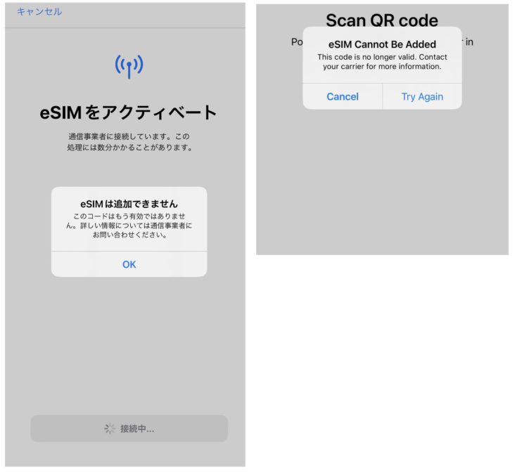 上記のエラー画面では、「このコードはもう有効ではありません。」と表示されていますが、eSIMはまだ有効で利用可能な場合が多いです。