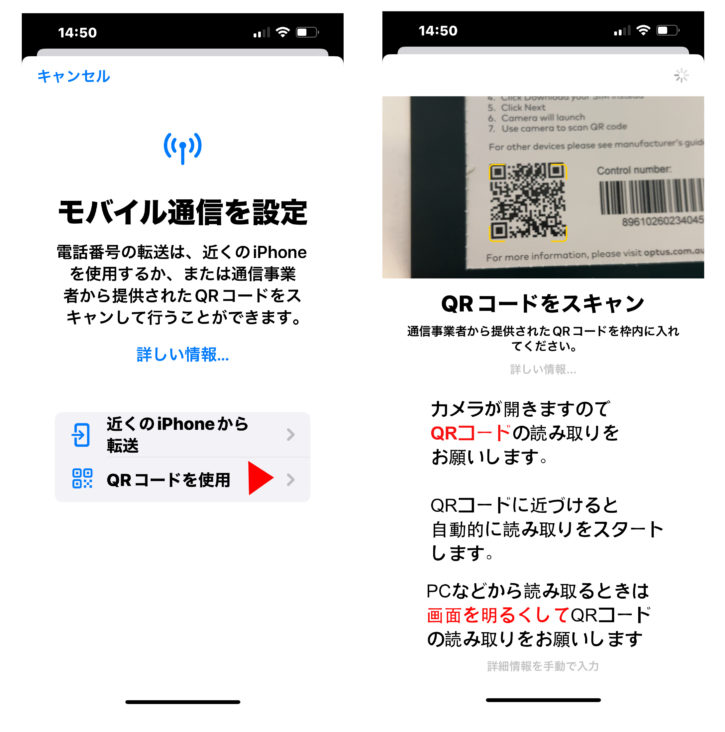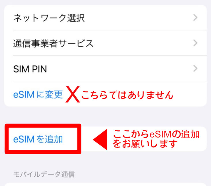 「eSIMに変更」からではなく、「eSIMを追加」を押してQRコードの読み込みをはじめてください