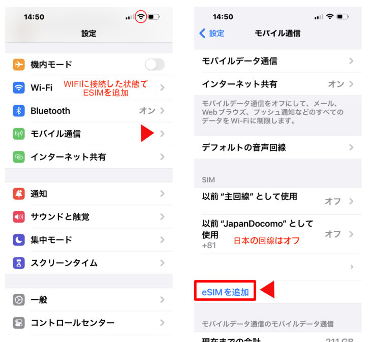 - 設定-> モバイル通信-> SIM=> 日本の回線をOFFにしてからeSIMの設定をお願いします