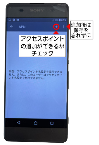 画面右上の「+」のボタンからAPNが追加できるか確認をお願いします。「このユーザーはアクセスポイント設定を利用できません」と表示されてもAPNを追加できるスマホも多いです。