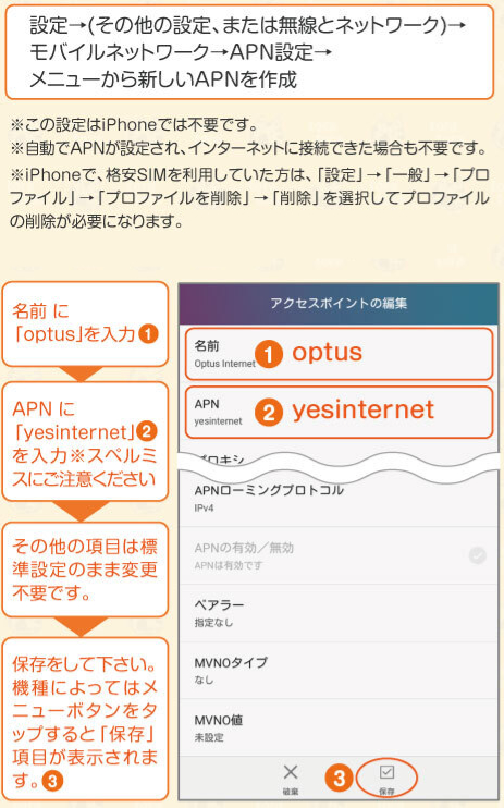 アンドロイドのスマホは、機種によってAPNの設定が必要な場合があります。例えば、オーストラリアでオプタスのSIMを利用する場合、こちらのAPNの設定をインストールすることでインターネットに接続ができます。