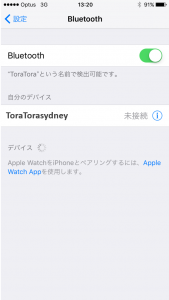 iPadでも同様に「Bluetooth」をオンにすると、接続できる端末が表示されます。ここでは、”ToraTora”をタッチしてしばらく待機