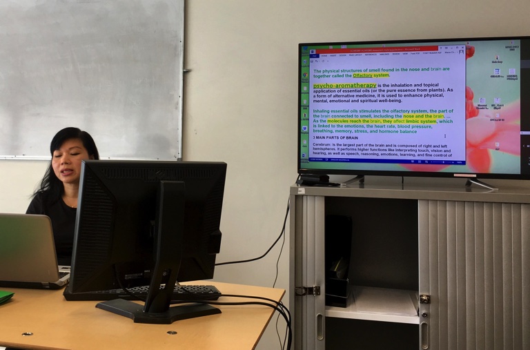 座学レクチャーでアロマセラピーの歴史や各エッセンシャルオイルの効能などを学び、