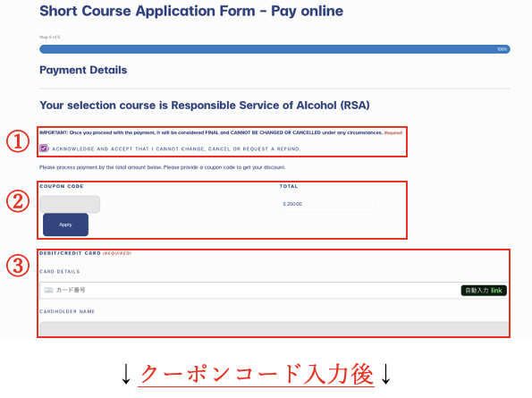 シドニーでRSAの申し込み準備ができたら、こちらのページより「割引クーポンコード」を利用してお申し込みが可能です。