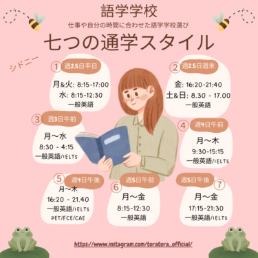 と思う方も多いと思います。週2.5日通学の語学学校は、2.5日間の拘束時間が長く、そんなに長く勉強に集中できない方も多いです。逆に週5日通学するメリットとして、1日の拘束時間は短いので、長期間学生ビザで延長する予定の方には、無理なく学校と仕事を両立することができます。