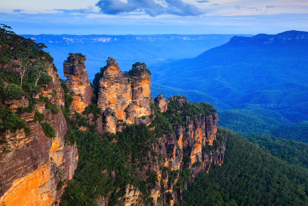 山脈全体に生い茂っているユーカリの葉から放出されるオイルにより光が屈折しシドニーから山脈全体が青く見えることからブルーマウンテンズと呼ばれるようになりました。世界遺産にも登録されている奇岩スリーシスターズの伝説は大変神秘的で、近くのルーラと呼ばれる町は可愛い町として人気があり、ニューサウス・ウエルズ州でもっとも有名な観光地です。