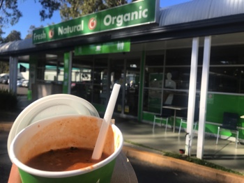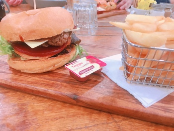 “Hunter Valley Garden”は、レストランやお土産屋さんなどが揃うショッピングモールで、結婚式も行われたりします。今回はカフェランチ付きだったので、「The Cellar」というレストランでハンバーガーとホットティーをいただきました。(バスの中でメニューが回ってきて、ハンバーガー、サラダ、チキンなどの中から1つ選びます。)