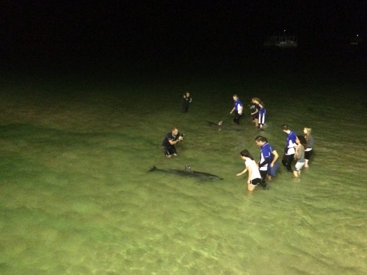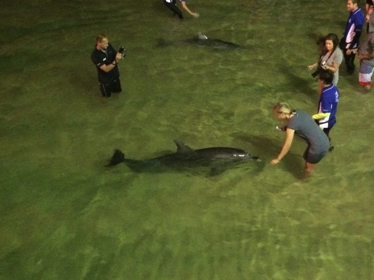 日が暮れてビーチの桟橋沿いにライトが当てられイルカを待っていると
