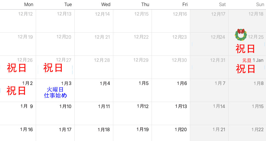 企業にもよりますが、12月9日を仕事納めとして、1月3週目の16日くらいまで会社がお休み、またはスタッフが最低限の人数で回しているという感じです。