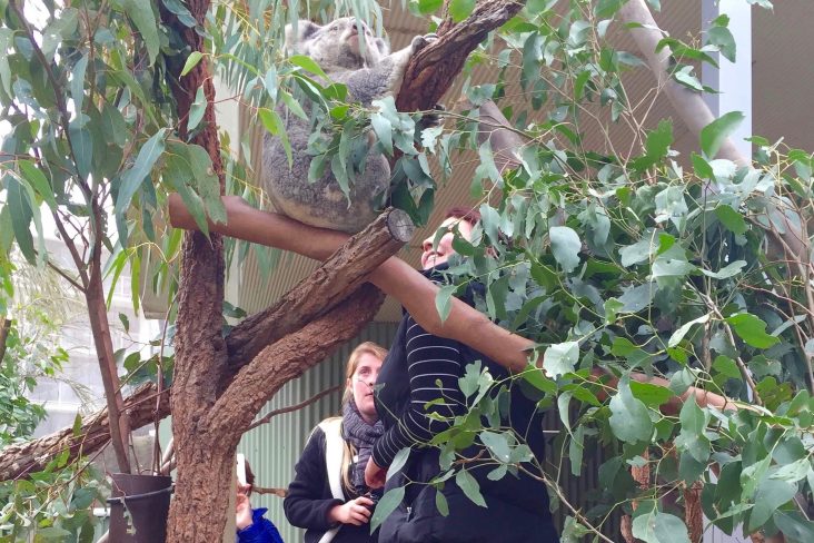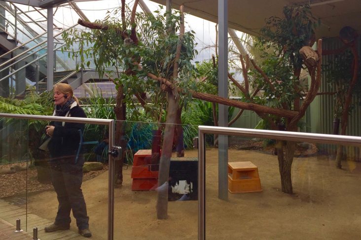 続いてはガムツリーバレー。空間全体が鳥の声と迫力のあるウォンバットの走る音など体全体で体感します。オーストラリアの蛇やトカゲ達も観察できます。コアラは特定の種類のユーカリの葉しか食べないので(栄養価は低いそうで)1日20時間近く寝る省エネな生活を送っています。この日も寝てらっしゃいました。