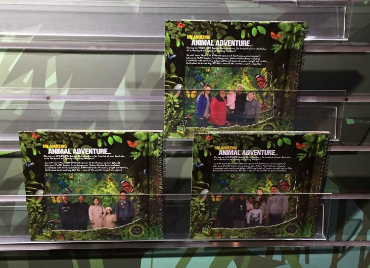 エントランスをくぐるとテ ンションの高いカメラマンが撮影をしてくれます。『ビッグスマ〜イル!わーコアラ!クロコダイルだ!キャー!!』という3カットをポージング。完成はお出口で。立派なブック型で40ドルです。記念にいいですね。