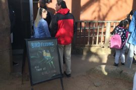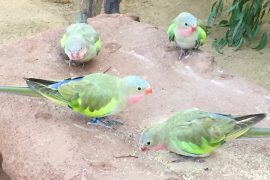 BIRD FEEDING(鳥の餌やり)のコーナーです。美しいカラフルなこちらの鳥はクイーンズランド州から南オーストラリア州、タスマニア州北西部にかけての東海岸で普通に分布するゴシキセイガイインコ。餌は花の蜜や花粉であり、蜜や花粉を食べるのに適した舌を持っているそうです。