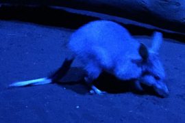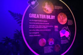 明るかった館内から突然暗闇の世界へ,だんだん目が慣れてくると暗闇の中から少しづつ動く何かを感じることができてきます。砂漠に生息している有袋動物、ウサギ耳 のBILBYは敵や昆虫の動く音を聞くために巨大な耳を持ち、またフルーツや菌類、球根を嗅ぎ分けるために長い鼻を持っています。