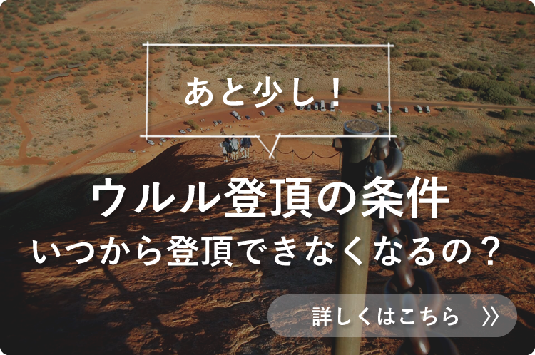 |  | 登頂したい方は、代替プランを考るのをおすすめします。もし登れなくてもウルルでしかできない貴重な体験があります!代替プランの立て方はこちらの体験談をご参考くださいませ! |