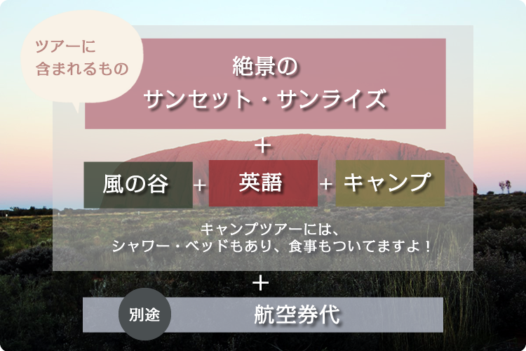 | どうしても登頂したい!「登頂のチャンスあり」の日本語ツアープラン エアーズロックを余すことなく楽しみたい!名所「ウルル/風の谷/グランドキャニオン」を巡る3日間 値段を抑えてどうしてもいきたい!格安の絶景「サンライズ・サンセット」を楽しむプラン 他人とは違うことをしてみたい!キャメルライド・ハーレー・ヘリコプターのプランなど「アクティビティ」付きのプラン |