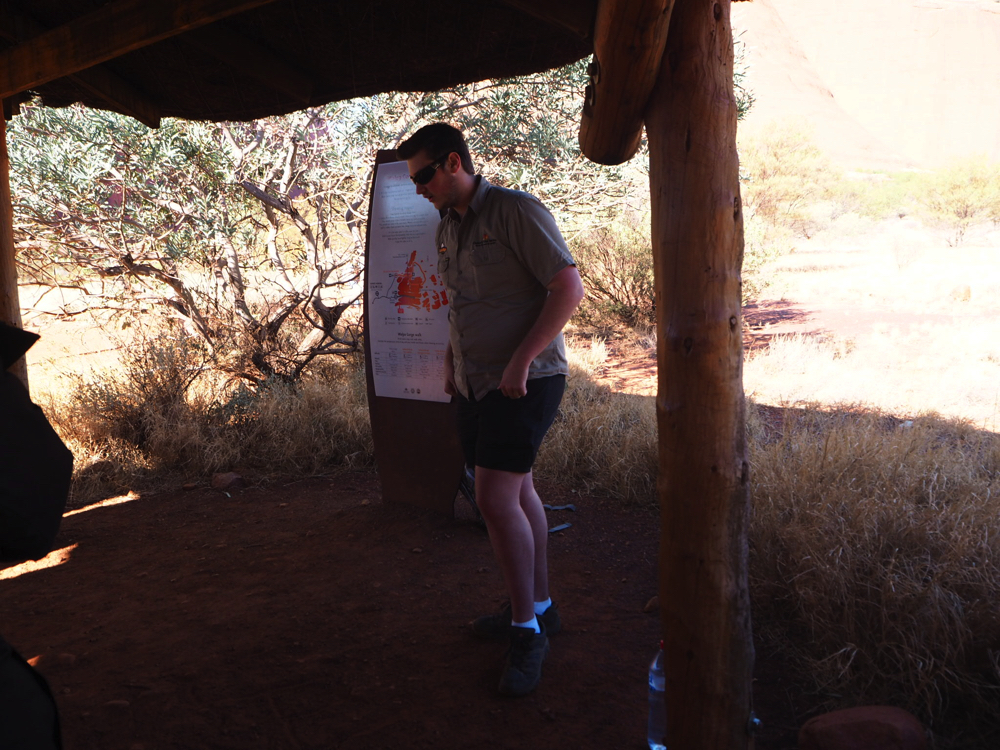 ウォーキング後は30分ほどの現地先住民アボリジニの方と現地スタッフによるウルルの歴史などの解説をしながら壁に刻まれた絵などを見て回りました。