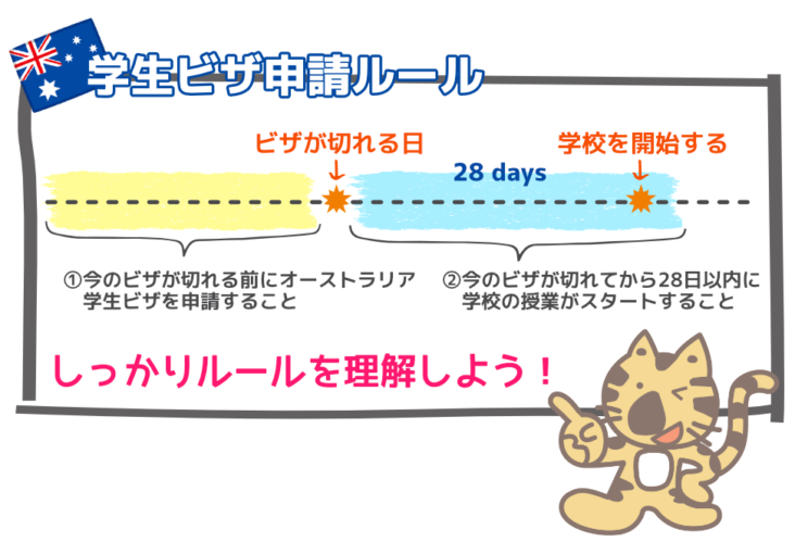 今のビザが切れてから、学校をスタートするまで28日以上ある場合、ビザ申請ができないためオーストラリアの滞在を延長することができません。